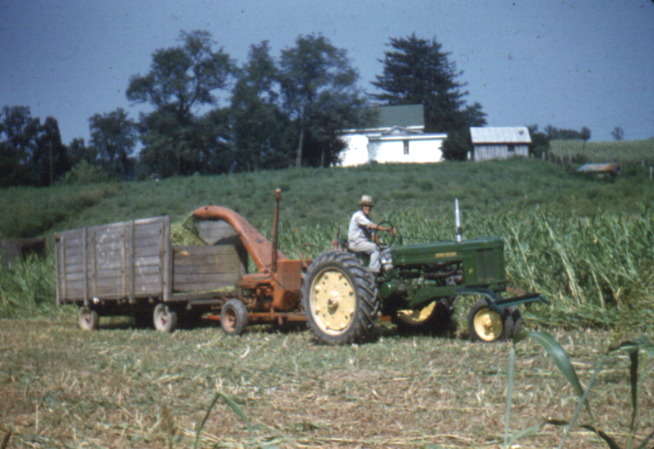 Making silage at Ernest Bond's farm on Broad Run. This was the final stage of the technology, using a forage harvester and putting it in the silo with a blower. This could be done by two or three men.