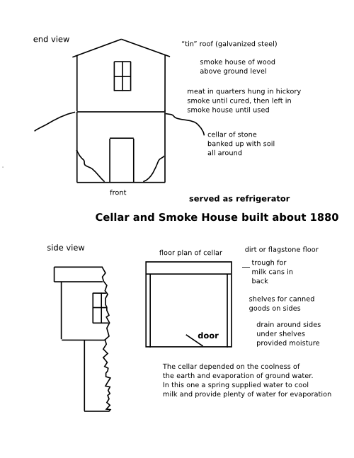 Near the house was a cellar and smoke house. The meat smoking process is traditional. Before the turn of the century all farms had a cellar dug into the earth with a smokehouse above the cellar, which also served as a larder or storage place for the smoked meat. Smoking is done more as a flavoring than as a preservative, but I imagine that the smokehouse atmosphere would have discouraged insects in the old days.